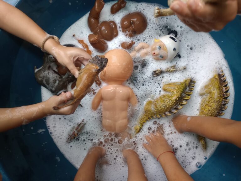 Aproveitamos também os dias mais quentes para lavar as bonecas e os animais de brinquedo. Foi um trabalho coletivo, no qual as crianças maiores ensinaram as menores como “dar banho nos brinquedos”, exercitando o cuidado, a cooperação e a troca de saberes.